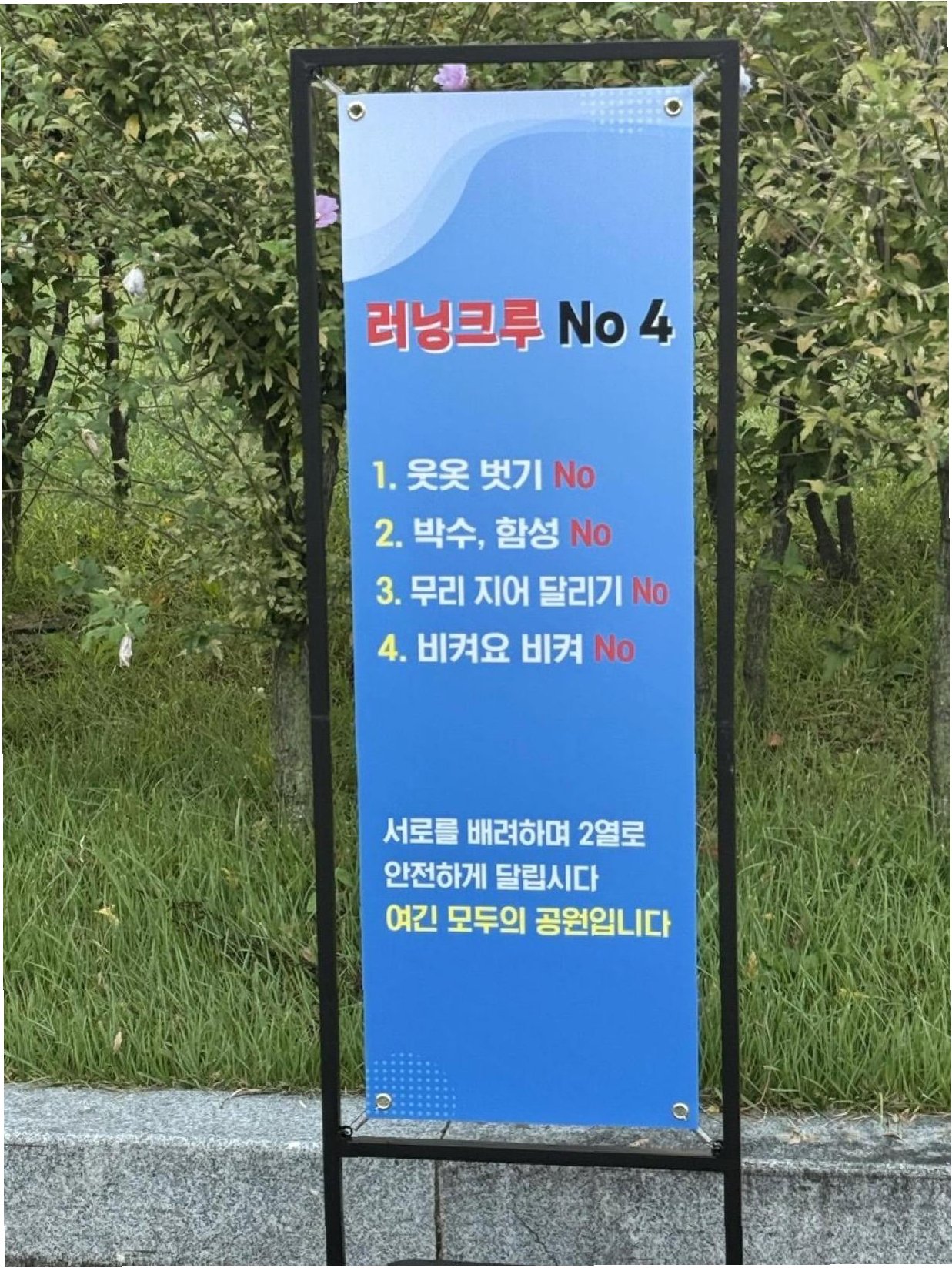 온라인 커뮤니티에 공개된 사진 한 장이 많은 이들의 눈길을 사로잡았습니다. 바로 여의도 공원 내에 설치된 '러닝크루 No 4'라는 제목의 안내판입니다. 이 안내판에는 △ 웃옷 벗기 No △ 박수·함성 No △ 무리 지어 달리기 No △ 비켜요 비켜 No 등 4가지 금지 수칙이 명시되어 있었습니다. 이는 쾌적한 공원 환경을 조성하고 다른 이용객들을 배려하기 위한 조치로 보입니다. 안내판에는 또한 “서로를 배려하며 2열로 안전하게 달립시다”, “여긴 모두의 공원입니다”라는 문구도 담겨 있어, 공원 이용자 모두가 함께 만들어가는 공간임을 강조하고 있습니다.