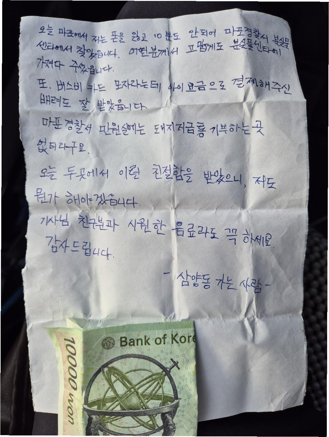 A 씨는 내릴 때 기사 손에 꼬깃한 종이를 쥐여주고 떠났다. 강 기사가 종점에 도착해 종이를 펴보니 만 원짜리 한 장과 함께 진심어린 글이 적혀있었다. 편지 내용에는 “오늘 마포에서 저는 폰을 잃고 10분도 안 되어 마포경찰서 분실물센터에서 찾았습니다. 어떤 분께서 고맙게도 분실물 센터에 가져다 주셨습니다. 또 카드 버스비가 모자라는데 아이 요금으로 결제해 주신 기사님의 배려도 잘 받았습니다. 오늘 두 곳에서 이런 친절함을 받았으니 저도 뭔가 해야겠습니다. 기사님, 친구분과 시원한 음료수라도 꼭 드세요. 감사합니다. -삼양동 가는 사람-“이라고 쓰여있었다.
