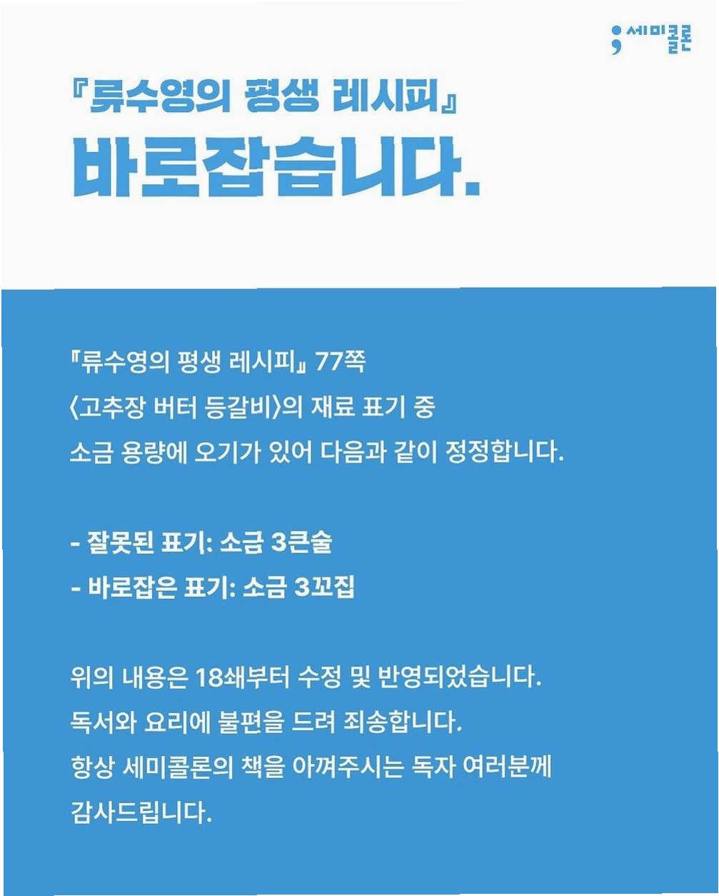 배우 류수영이 요리책 '류수영의 평생 레시피'로 베스트셀러 작가 반열에 올랐습니다. 하지만 기쁨도 잠시, 책 속 레시피 표기 오류를 정정하는 공지를 발표하며 독자들에게 사과했습니다. 출판사 세미콜론은 류수영의 저서 '류수영의 평생 레시피' 속 재료 표기 오류를 수정했다고 밝혔습니다. 특히 '고추장 버터 등갈비' 레시피에서 소금 용량이 잘못 표기된 부분을 바로잡았습니다. 소금 3큰술이 소금 3꼬집으로 정정되었으며, 해당 내용은 18쇄부터 수정 및 반영되었습니다. 이 소식에 많은 독자들이 유쾌하게 반응하며 류수영의 요리책에 대한 뜨거운 관심을 다시 한번 입증했습니다.