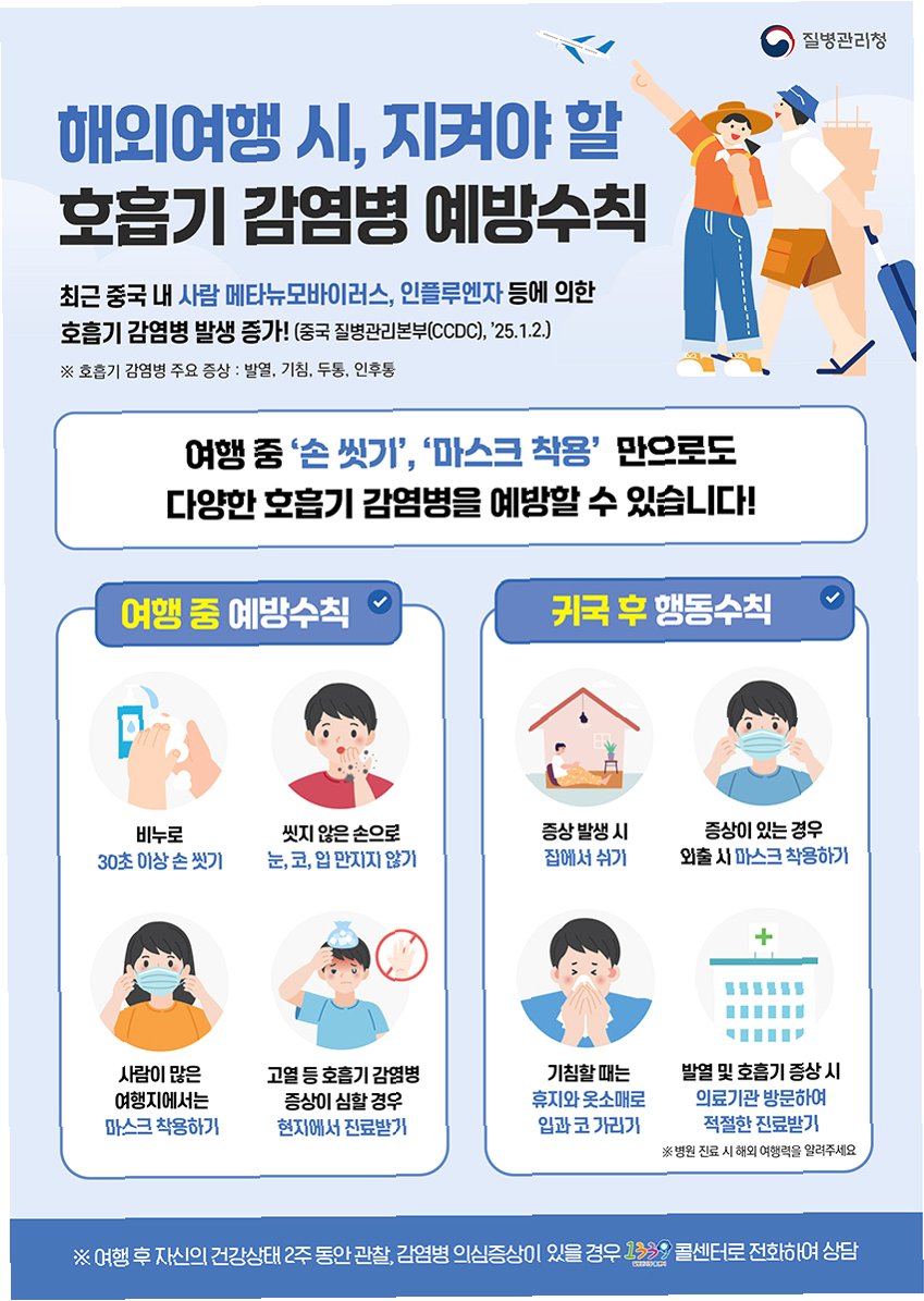 일본과 대만에서 독감 유행이 시작되었습니다. 여행객들은 개인위생 관리와 예방 수칙 준수를 통해 건강을 지켜야 합니다. 특히, 고위험군은 백신 접종을 고려하고, 의심 증상 발생 시 즉시 의료기관을 방문해야 합니다.