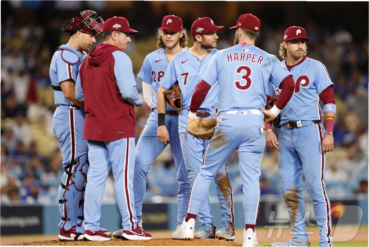 이어 브라이스 하퍼의 좌전 안타, 알렉 봄의 중전 안타가 터졌다. 봄의 안타 때 다저스 중견수 앤디 파헤스의 실책이 아쉬웠다. 3루 송구가 덕아웃으로 빠졌고, 하퍼가 홈에 들어오면서 봄이 3루까지 갔다. 2-1로 역전하며 계속된 무사 3루에서 브랜든 마쉬의 좌익수 희생플라이로 필라델피아가 추가점을 냈다. 5회초에도 필라델피아는 브라이슨 스탓과 트레이 터너의 연속 안타로 다저스 선발 야마모토를 강판시켰다. 투구수가 67개밖에 되지 않았지만 데이브 로버츠 다저스 감독은 무사 1,2루 위기에서 불펜을 가동했다. 좌완 앤서니 반다가 더블 스틸 허용했지만 슈와버를 헛스윙 삼진 처리하며 한숨 돌렸다. 이어 하퍼를 우익수 짧은 뜬공으로 유도한 베시아는 봄을 자동 고의4구로 1루를 채운 뒤 마쉬를 헛스윙 3구 삼진 잡고 실점 없이 5회초 위기를 넘겼다.