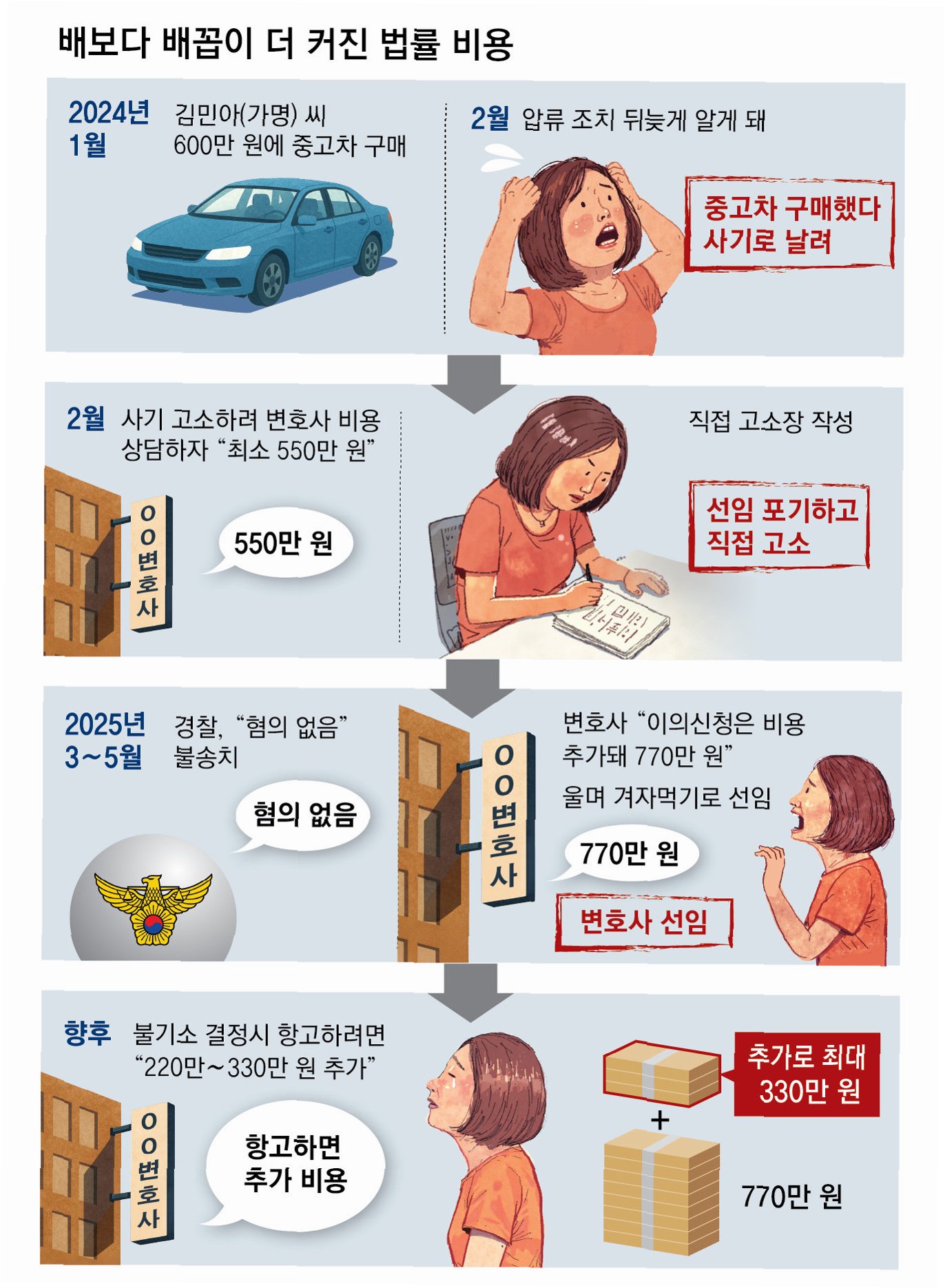 지방직 공무원 김민아 씨는 중고차 사기로 600만 원을 잃었지만, 고소 과정에서 발생한 변호사 비용이 1100만 원을 넘어서면서 이중고를 겪었습니다. 차량 가격보다 더 큰 변호사 비용 부담에 김 씨는 좌절감을 느껴야 했습니다. 이처럼 사기 피해를 입은 많은 사람들이 억울함을 호소조차 못 하는 현실입니다.