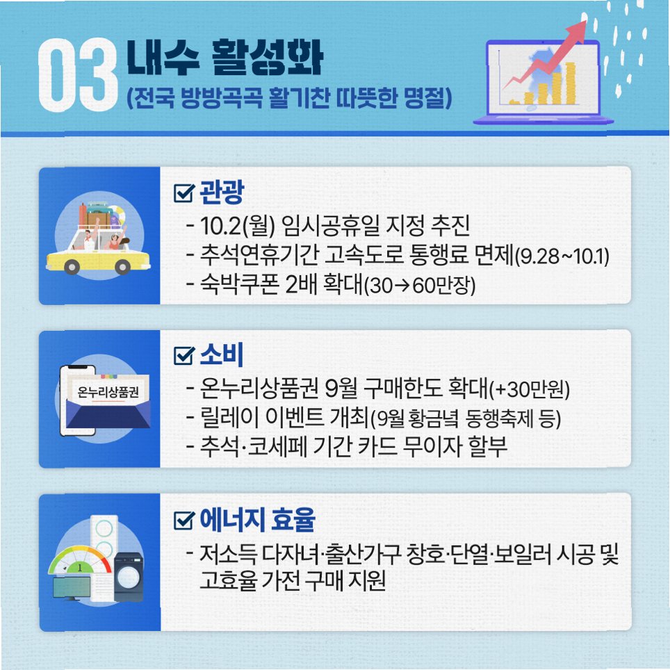 정부의 발표에 따라, 올해 추석 연휴는 기존 계획대로 진행될 가능성이 높아 보입니다. 10일의 황금 연휴를 기대했던 분들에게는 아쉬움이 남겠지만, 이번 결정을 통해 정부가 내수 경제 활성화와 국가 경제 전반을 고려하여 신중하게 결정을 내린 것을 알 수 있습니다. 남은 기간 동안 알찬 연휴 계획을 세우고, 가족, 친지들과 함께 풍성한 추석을 보내시길 바랍니다.