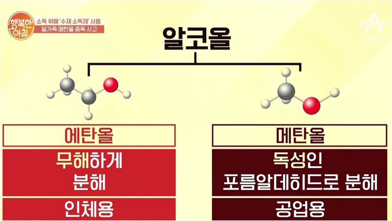 A.메탄올 중독 시 두통, 구토, 시력 손상 등의 증상이 나타날 수 있으며, 심한 경우 사망에 이를 수 있습니다.