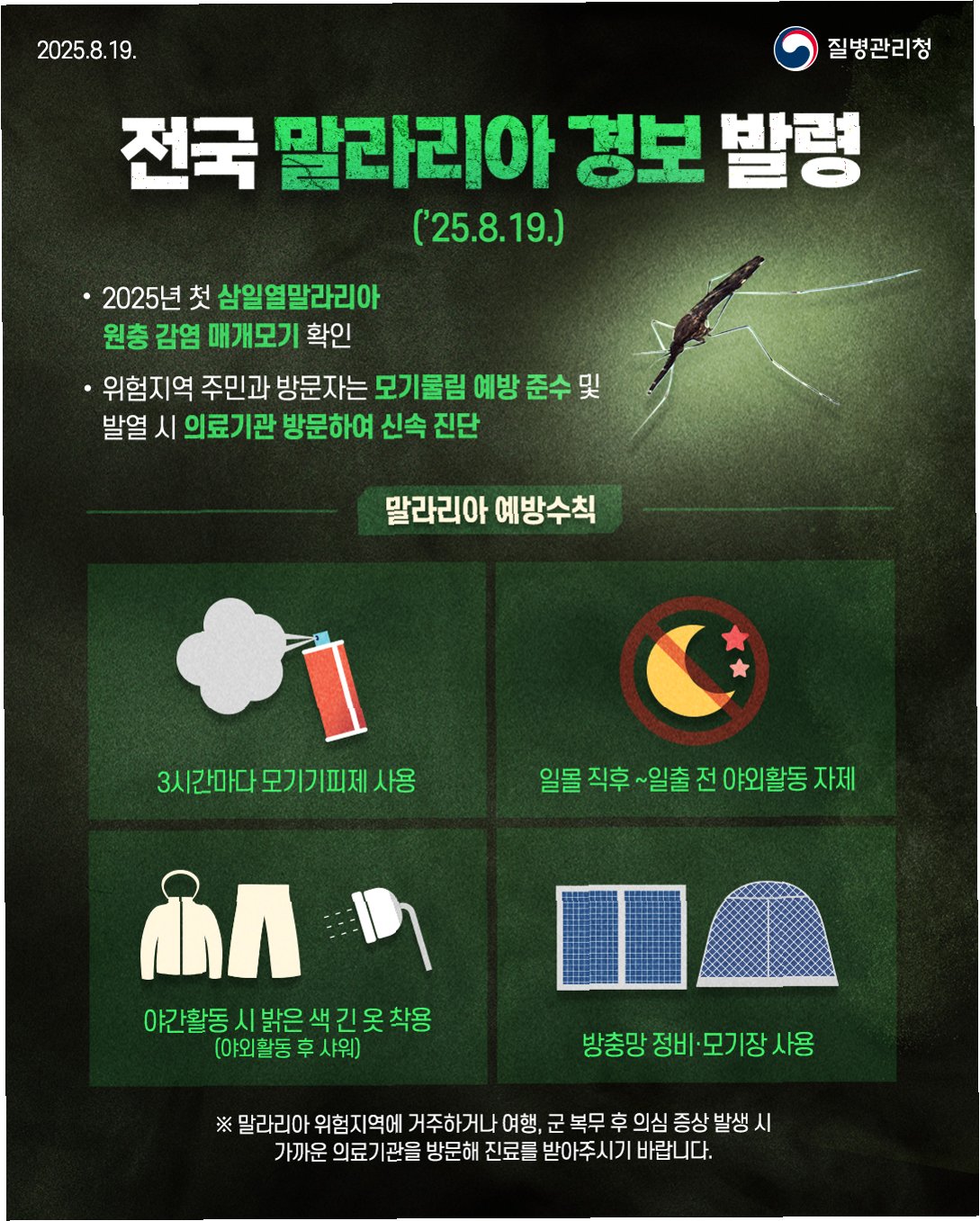 전국 말라리아 경보 발령! 백신 없는 말라리아, 저녁 시간대 모기 조심! 얼룩날개모기 특징, 개체 수 급증 원인, 증상과 대처법, 예방 수칙 숙지 필수! 적극적인 참여로 건강을 지켜요!
