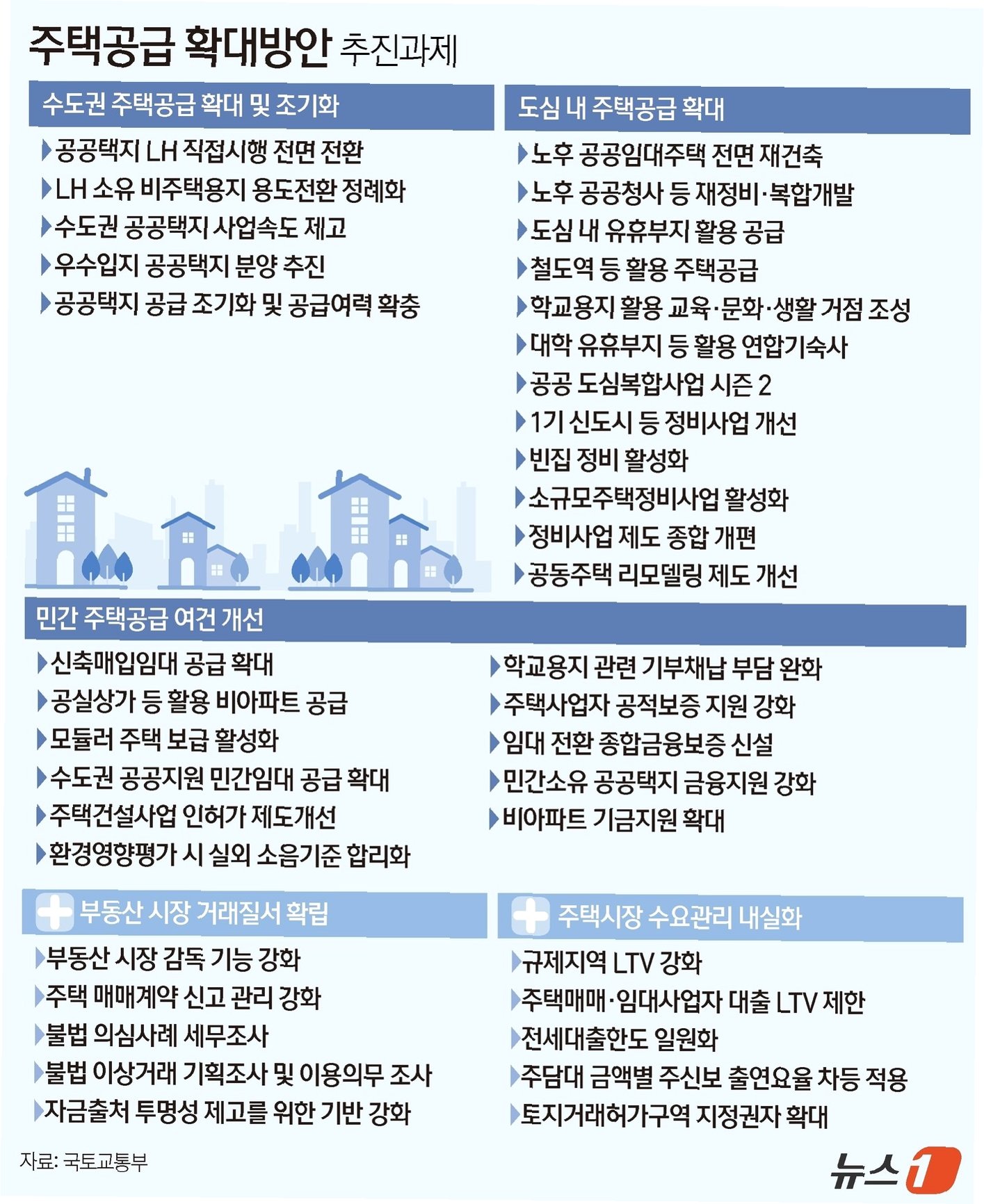 A.LH 직접 시행을 통한 공공택지 개발, 재건축·재개발 활성화, 그리고 대출 규제 강화를 통한 수요 억제입니다.