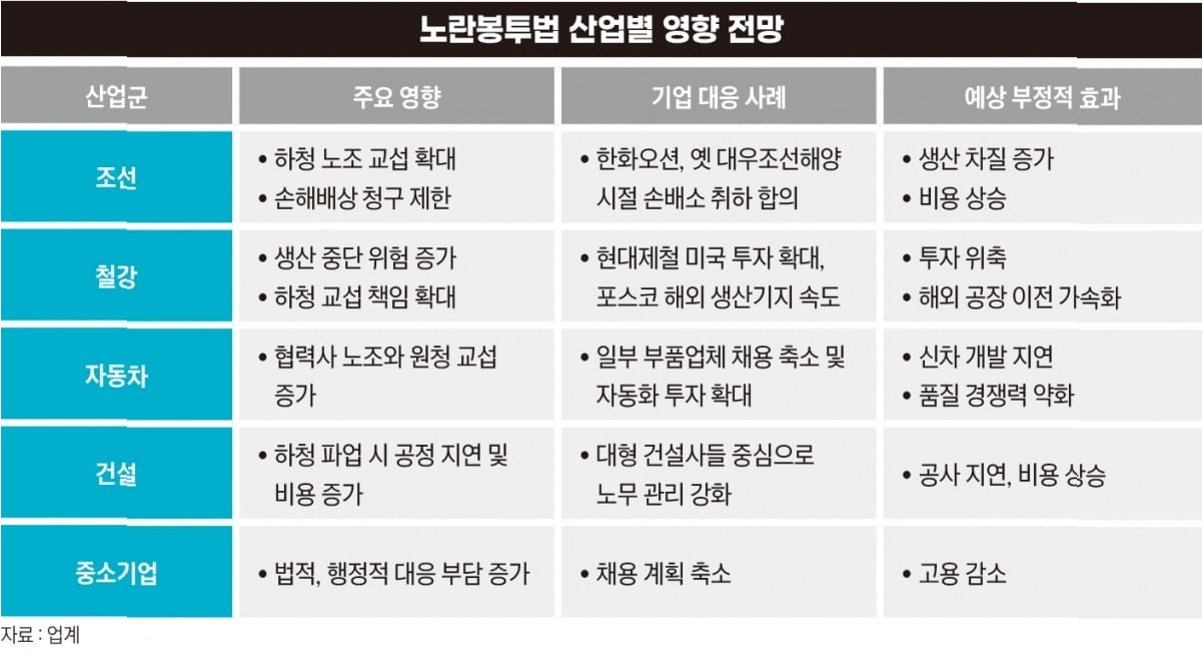 특히 하도급 노동자에 관한 원청 책임 강화와 쟁의행위 범위 확대를 골자로 한 노란봉투법에 대한 기업들의 우려는 상상 이상이다. 특히 다단계 협업체계인 자동차·조선·철강·건설 업계 등은 하청 노조의 교섭 요구와 파업이 빈번하게 발생하면 산업 경쟁력 저하가 불가피하다. 일각에서는 산업 생태계가 무너질 가능성마저 있다는 목소리가 나온다.